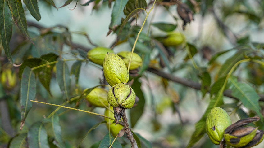 薄壳山核桃,又名美国山核桃、长山核桃、碧根果,原产于美国和墨西哥。1974年,云南省林业和草原科学院首次将其作为干果树种引入云南,种植在漾濞核桃研究院内,漾濞也成为了云南最早引种薄壳山核桃的县。