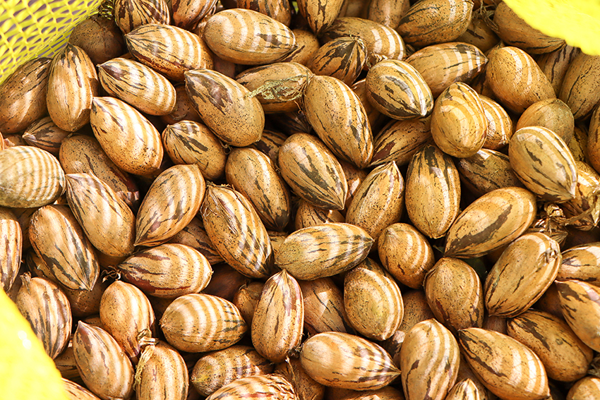 测产现场,专家组随机抽取了3.02亩测产样地,对29株薄壳山核桃进行全采全测。测产结果为,鲜果平均粒重9.0004克,干果平均粒重8.039克,坚果含水率为10.72%。测产样地干果总产量1011.61千克,平均亩产干果334.97千克/每亩。